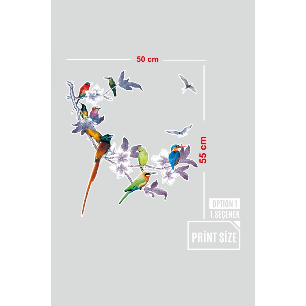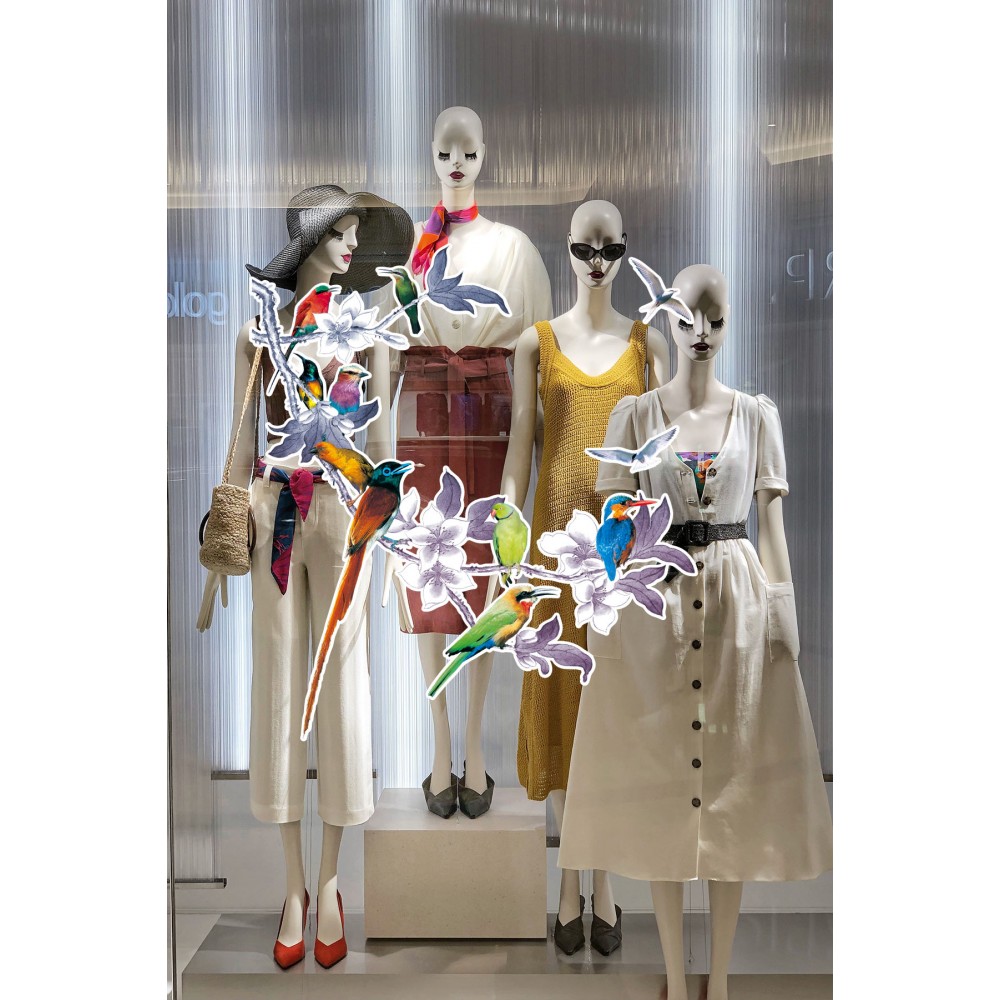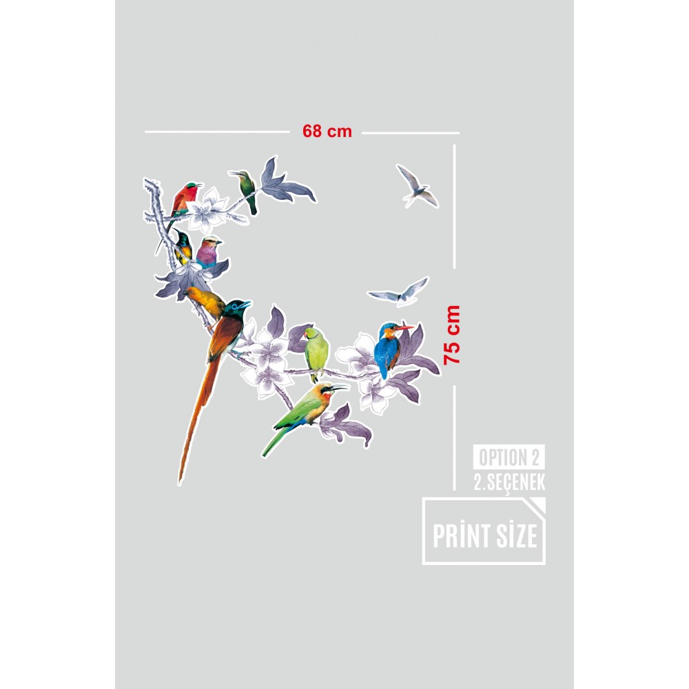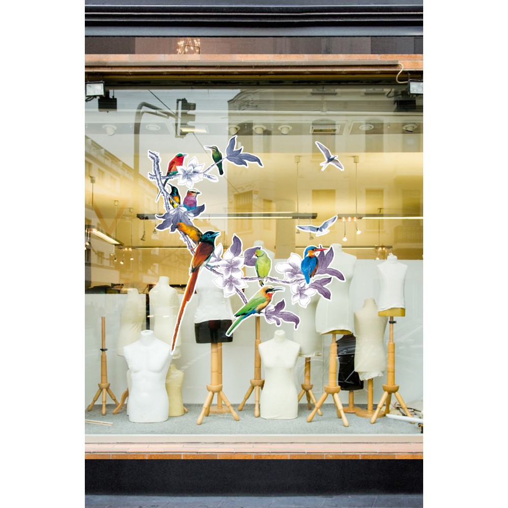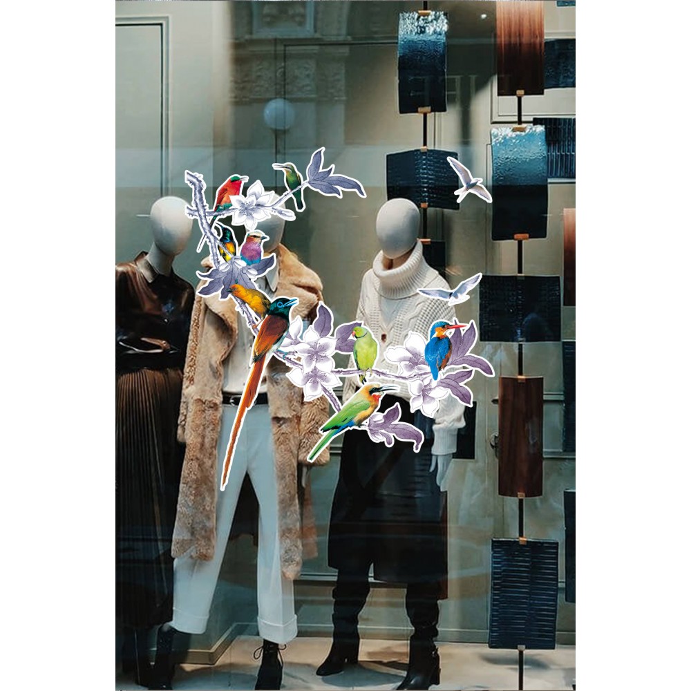 Çiçekli Ağaç Dallının Üstünde Renkli Kuşlar Mağaza Vitrin Cam Stickerı
