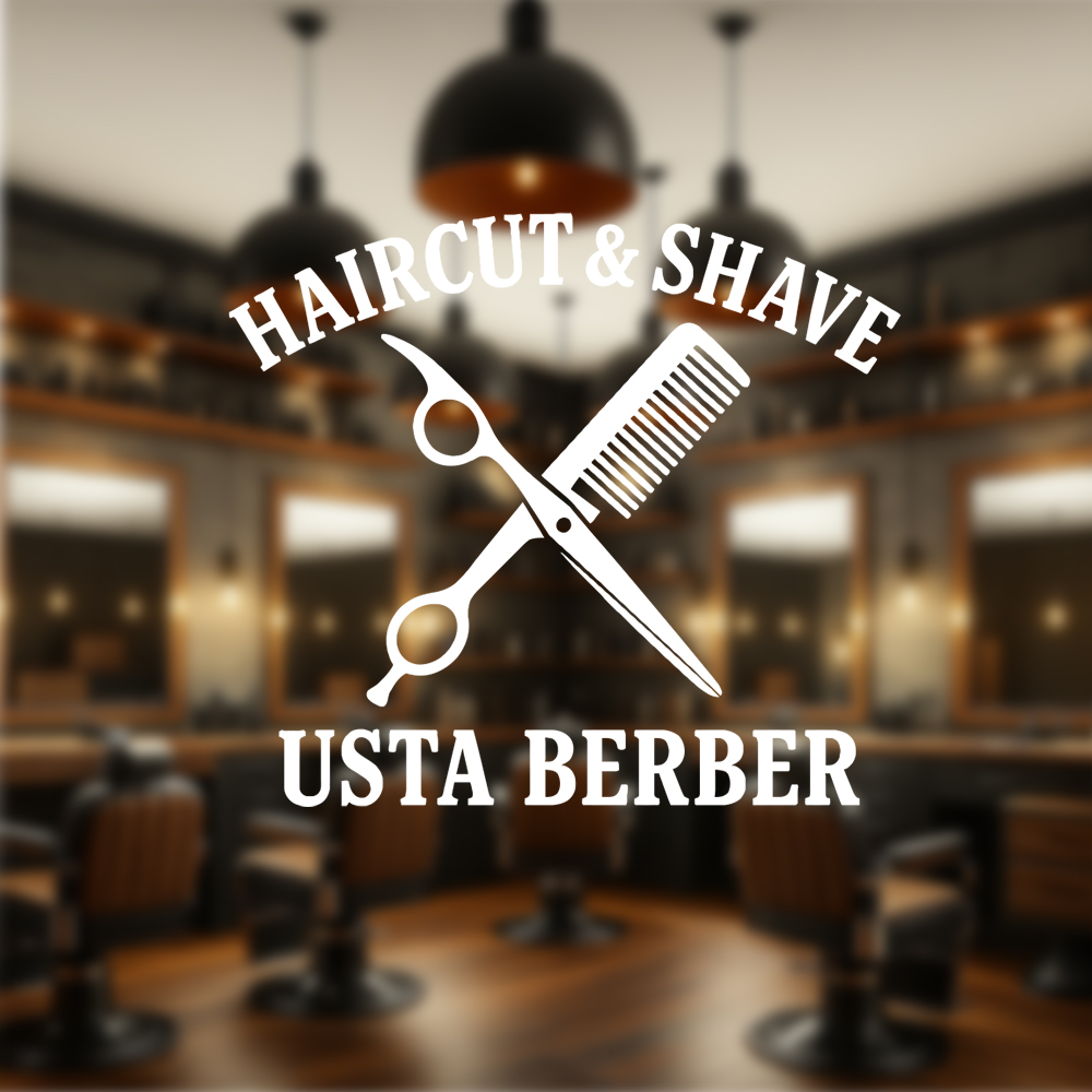 Makası ve tarağı simgeleyen klasik ikonlar, "Haircut & Shave" üst yazısı ve güçlü "USTA BERBER" vurgusu ile vitrin camınıza profesyonel bir görünüm kazandırın.