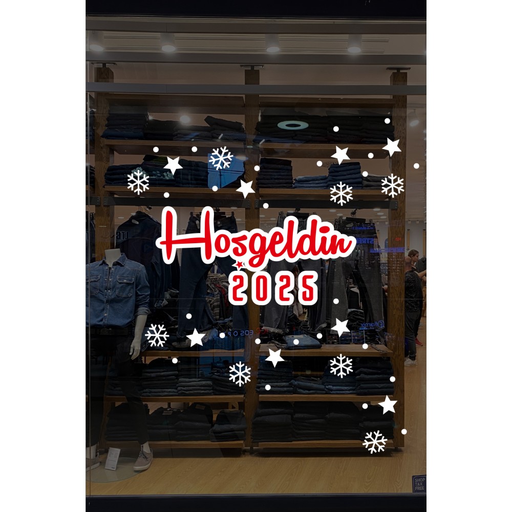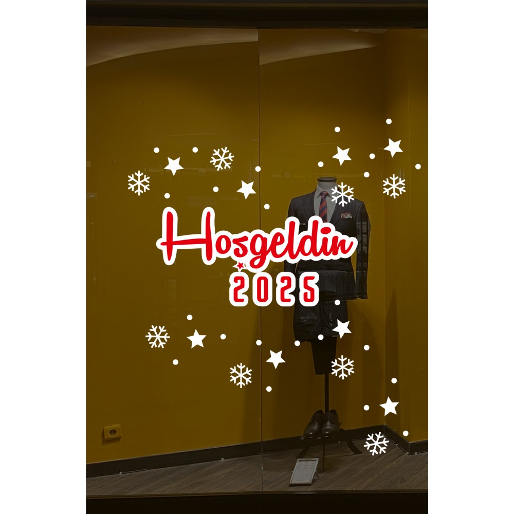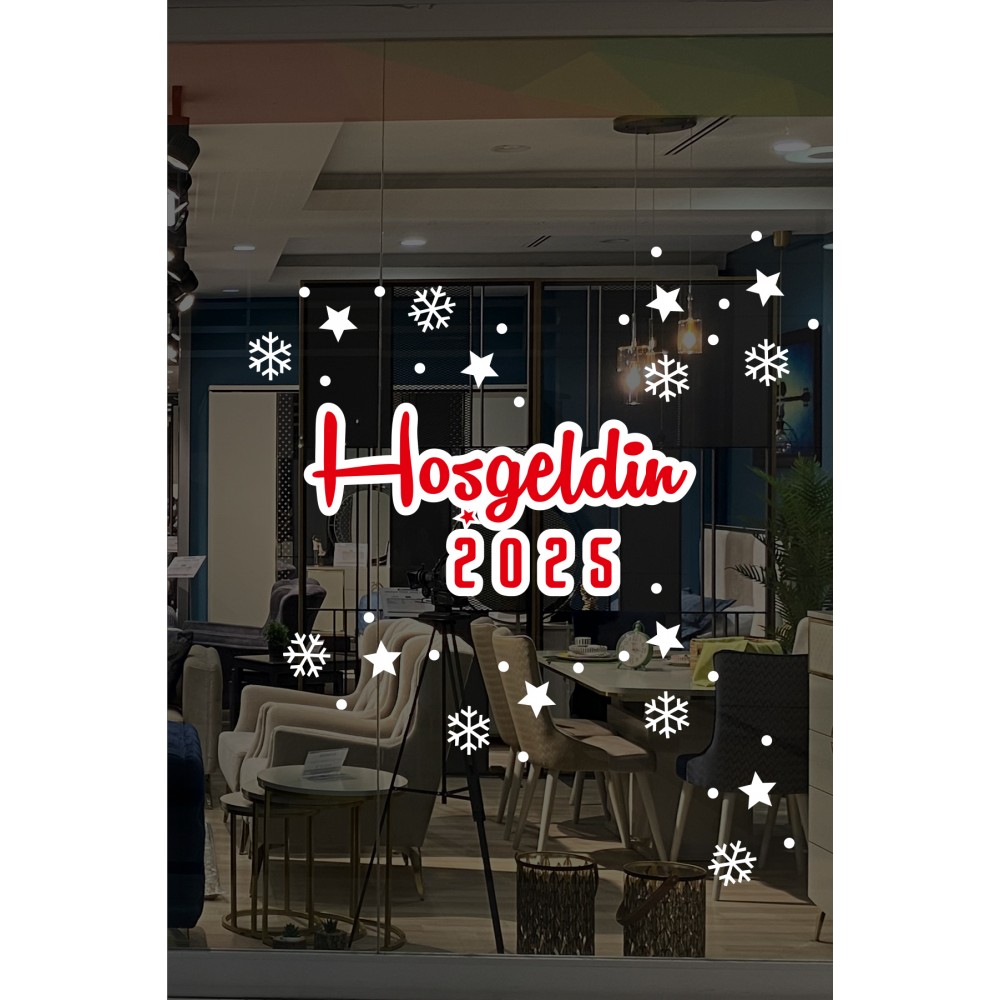 Hoşgeldin 2025 Yazısı Kar Taneleri ve Yılbaşı Vitrin Stickerları 70x70cm