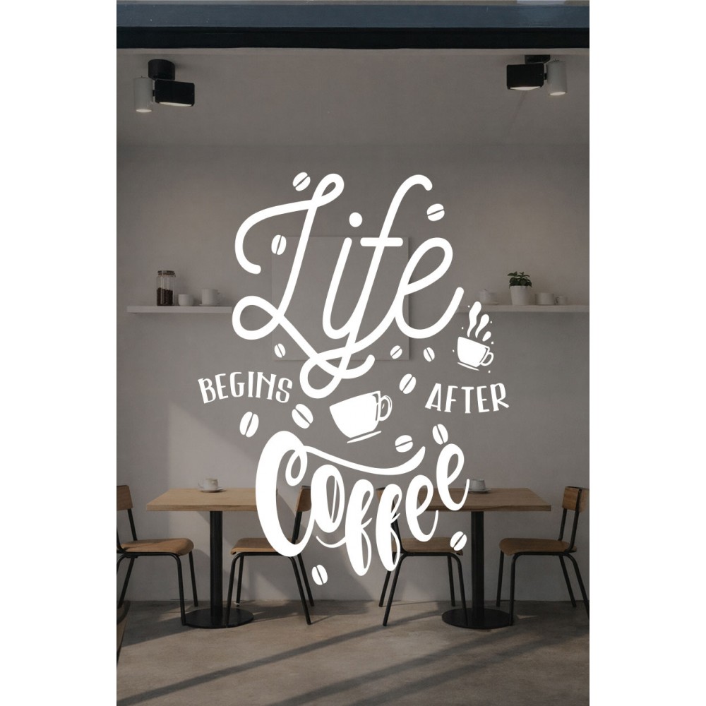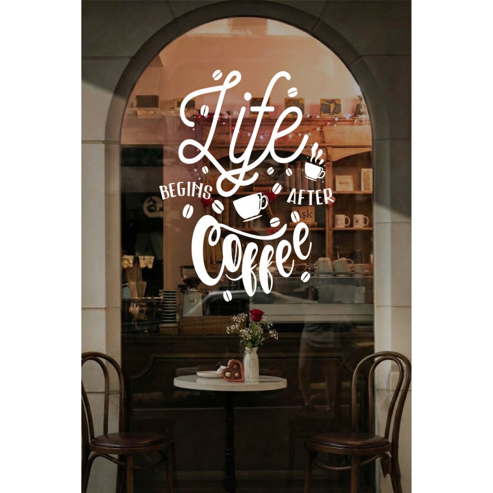 Kafe ve Restoranlara Özel Life Begins After Coffee Yazılı Cam Sticker – Kafe Duvar & Vitrin Dekoru – Kahve Temalı Yazı Sticker