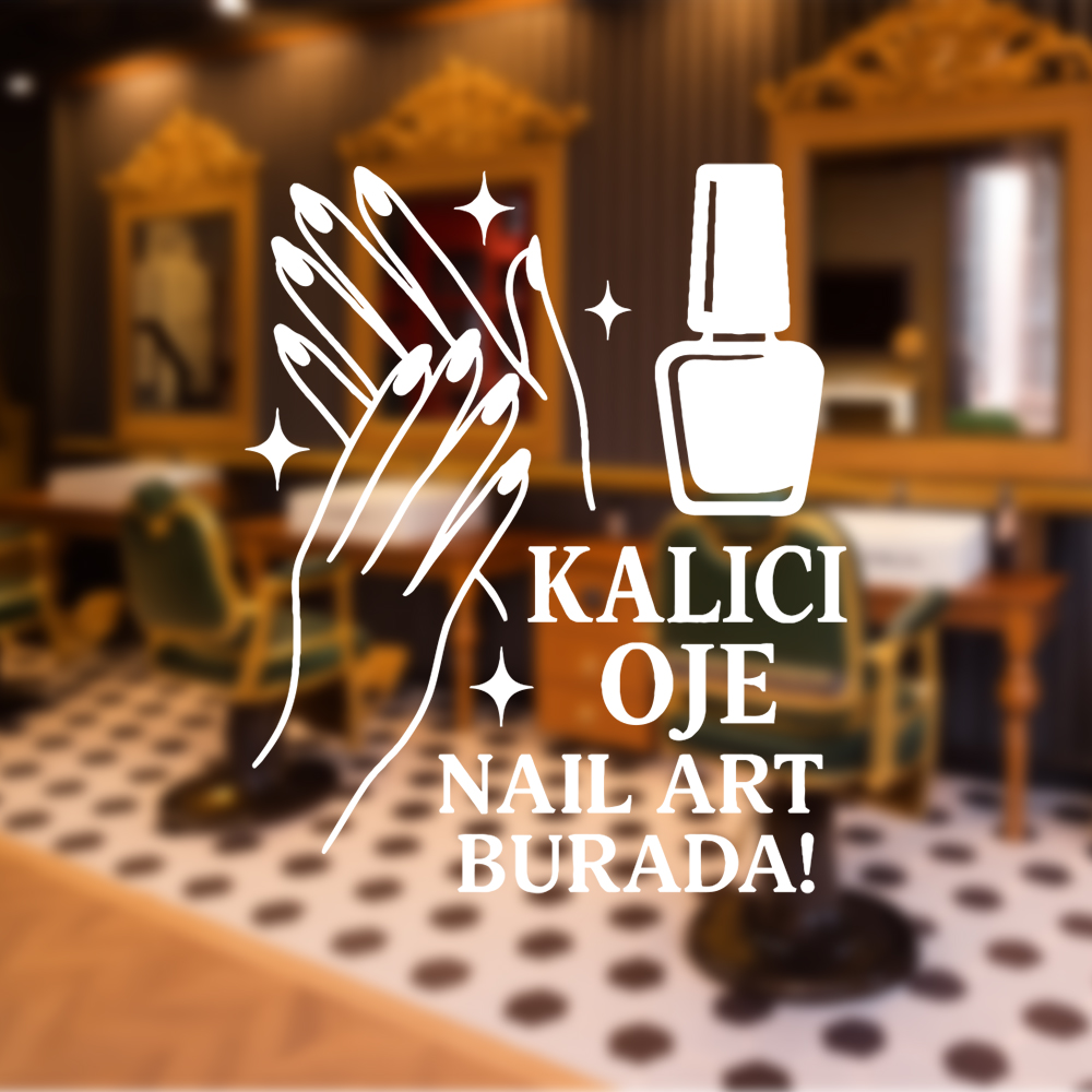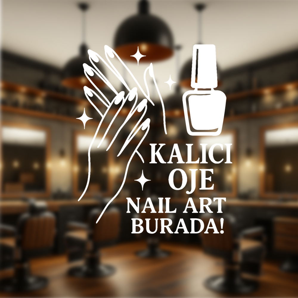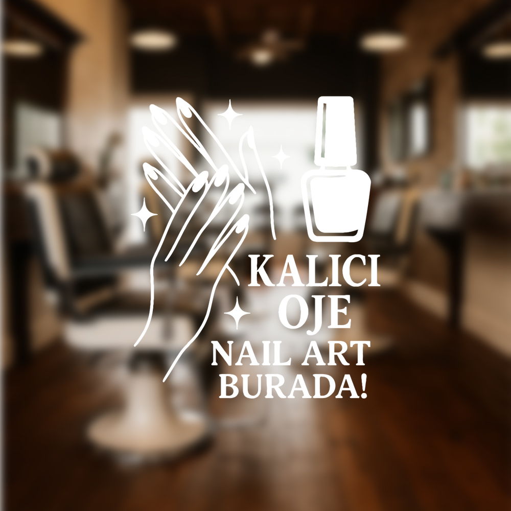 • “Kalıcı Oje” ve “Nail Art Burada!” yazılı bu şık cam sticker, el ve oje ikonlarıyla modern ve havalı bir görünüm sunar.