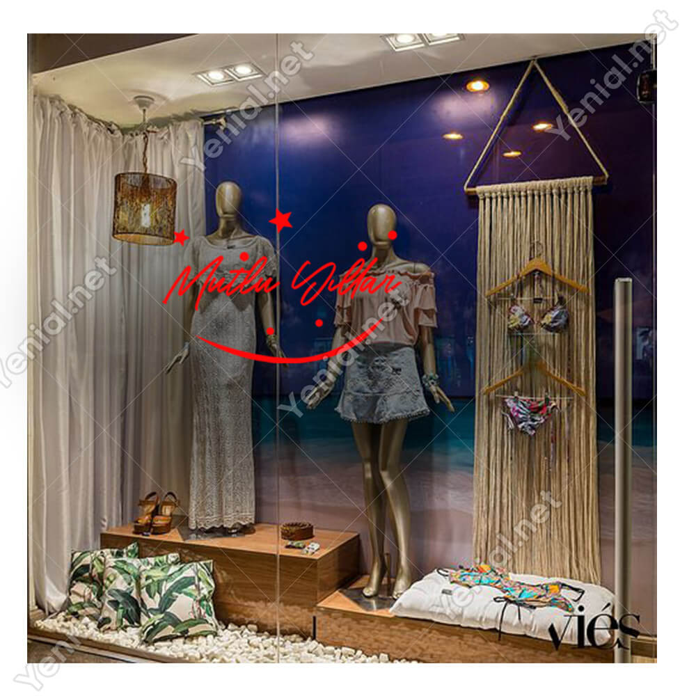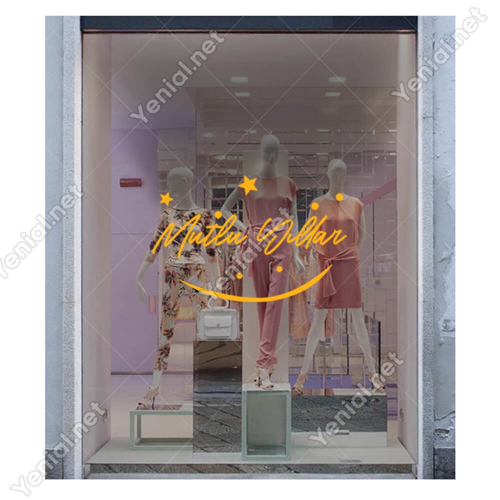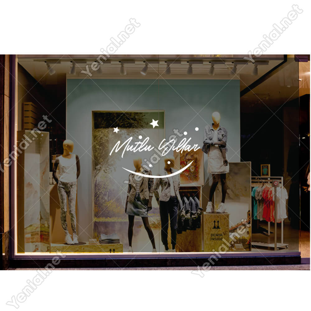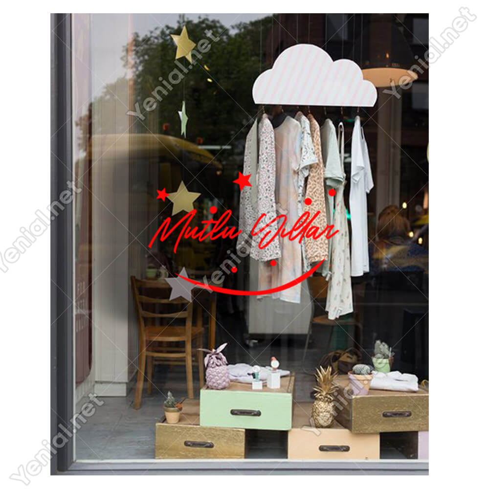 Mutlu Yıllar Yazısı ve Gülücük İşareti Simgesi Yılbaşı Cam Vitrin Mağaza Süslemeleri Ev Vitrin Yılbaşı Stickerı