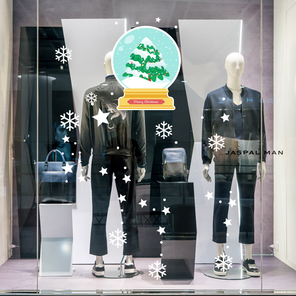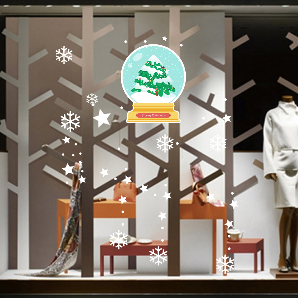 Sihirli Dünya Kar Tanesi ve Yılbaşı Ağacı Vitrin Süslemeleri Sticker 70x70cm Ev Vitrin Yılbaşı Stickerı