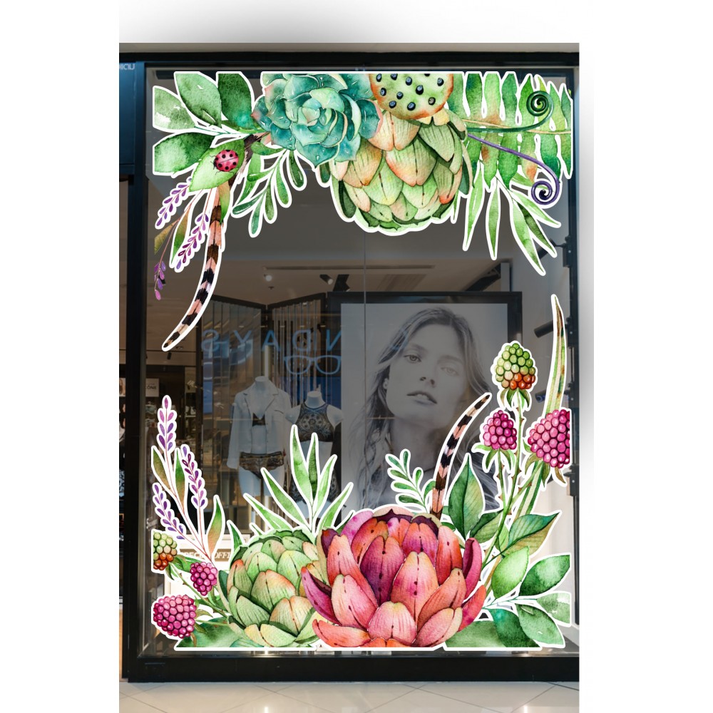 •       Yeşilin insanda yarattığı bahar huzurunu vitrinlerinize taşıyın. Sulu boya efektleriyle beraber zenginleştirilmiş kereviz çiçeği görseli vitrininizi renklendirin. Göz alıcı, canlı renklere sahip vitrin stickerları ile standarttan ayrılın ve akılda kalıcılığınızı arttırın. İnsanlar her gün binlerce mağazanın önünden geçiyor. Bu da binlerce vitrin görmeleri demektir. Peki bazı vitrinlerin diğerinden daha çok akılda kalması sizce tesadüf mü? Cevabını verelim. Hayır!
