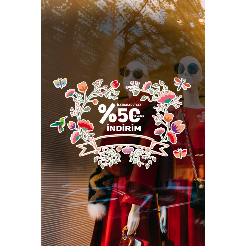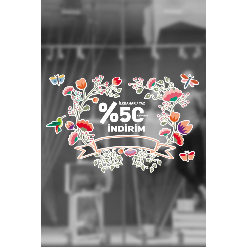 Uçuşan Kelebekler İlkbahar Yaz %50 İndirim Yazısı Mağaza Vitrin Cam Stickerı