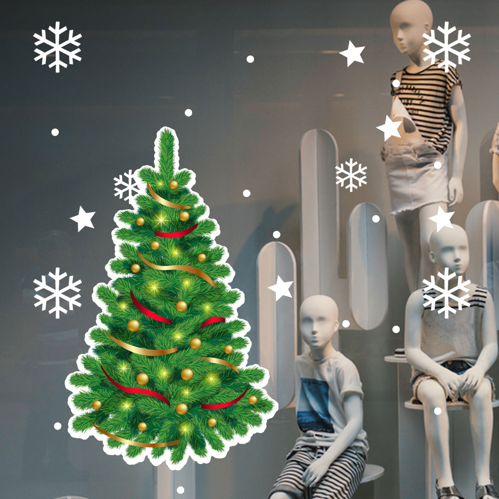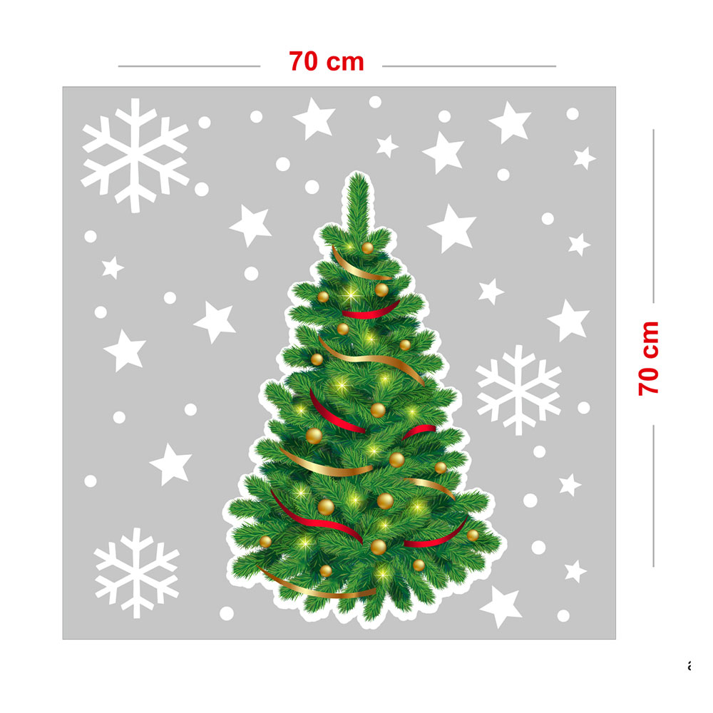 Yılbaşı Ağacı Kar Taneleri Süslemeli Yılbaşı Vitrin Sticker Yapıştırma 70x70cm Ev Vitrin Yılbaşı Stickerı